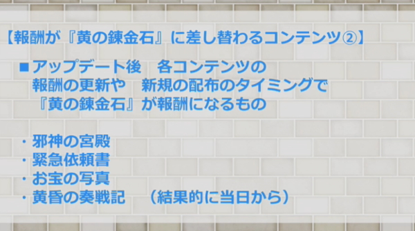バージョン3.5で追加される装備品は全てレベル93以上の装備品です。 そのレベル93以上の装備品を強化するには今までの「緑の錬金石」ではなく、「黄の錬金石」が必要になります。