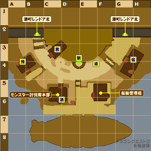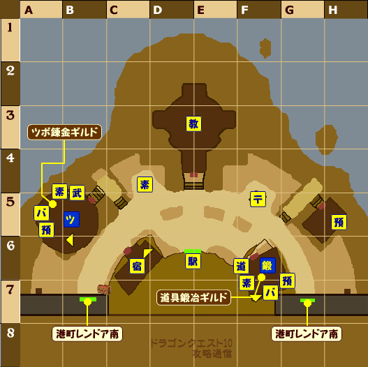 | 教=教会、宿=宿屋、バ=バザー、〒=郵便局、預=預かり所、酒=酒場 駅=鉄道駅、武=武器屋、防=防具屋、道=道具屋、素=素材屋 ツ=ツボ錬金設備、鍛=鍛冶設備 |