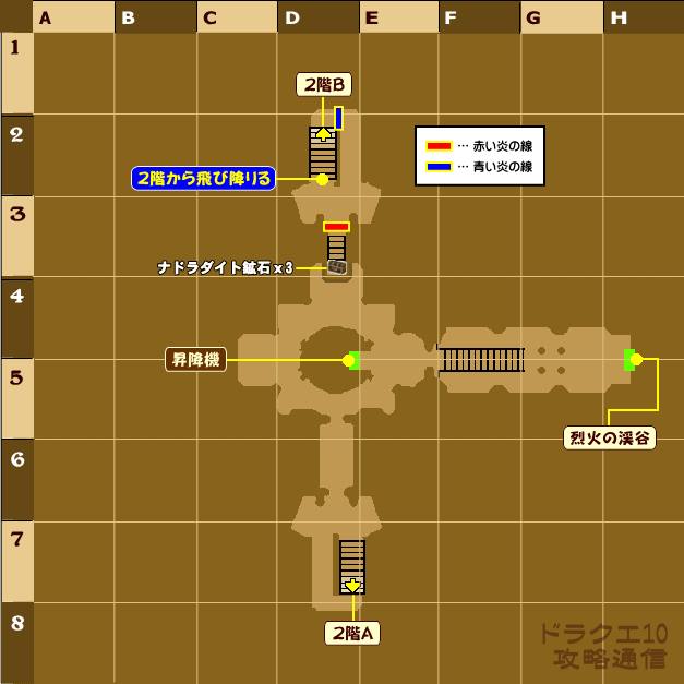 赤い炎の壁が先を遮っているマップ。 赤い炎の壁は青い炎を消すと通れるようになります。 その効果は青い炎の線を通ると消えてしまいます。 なおこのマップでは逃げることができないので注意しましょう。 ボスを倒して3つの鎖を切ると1階の昇降機から7階へ上がれるようになります。