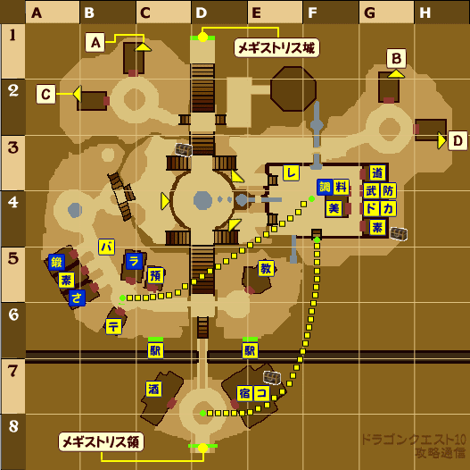 教=教会、宿=宿屋、バ=バザー、〒=郵便局、預=預かり所、酒=酒場 駅=鉄道駅、武=武器屋、防=防具屋、道=道具屋、素=素材屋、 料=料理屋、レ=レシピ屋、美=美容院、ド=ドレスアップ屋、カ=カラーリング屋 コ=旅のコンシェルジュ ラ=ランプ錬金設備、鍛=鍛冶設備、さ=さいほう設備、調=調理設備 |