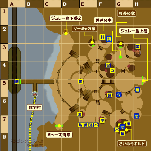 教=教会、宿=宿屋、バ=バザー、〒=郵便局、預=預かり所、酒=酒場 駅=鉄道駅、武=武器屋、防=防具屋、道=道具屋、素=素材屋 料=料理屋、コ=旅のコンシェルジュ ツ=ツボ錬金設備、鍛=鍛冶設備、さ=さいほう設備、調=調理設備 |