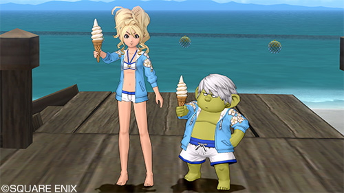- キュララナビーチ・D-8にいるスイミアの前でチャットのまわりにで「まなつのうみにかんぱい」と発言し、お花のパーカー水着を受け取る。